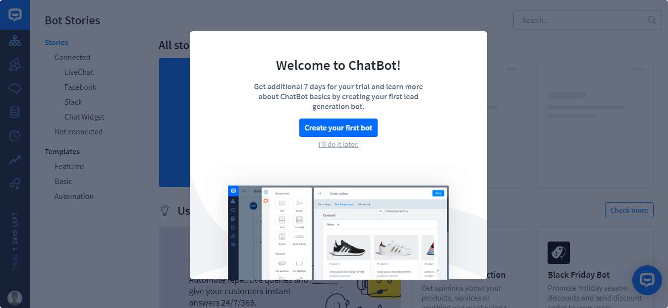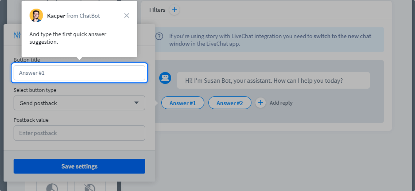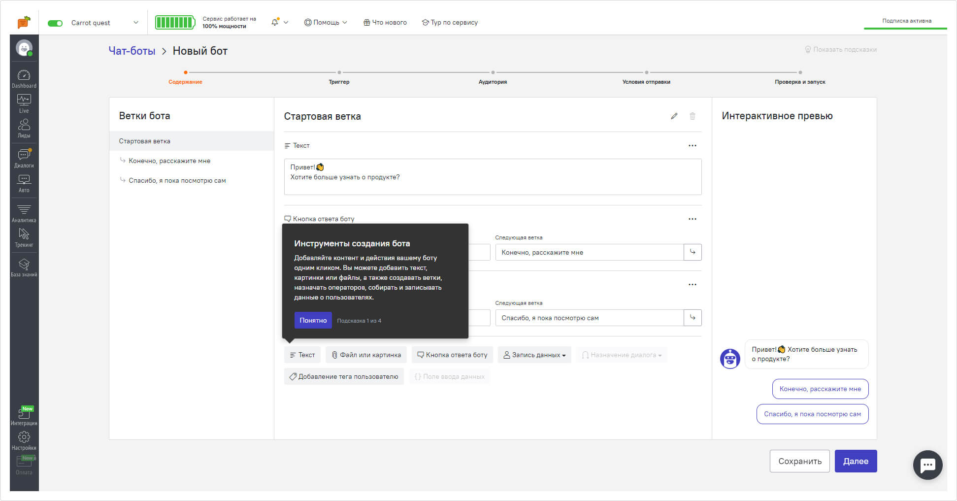 Всплывающие подсказки при первой настройке бота в сервисе ChatBot